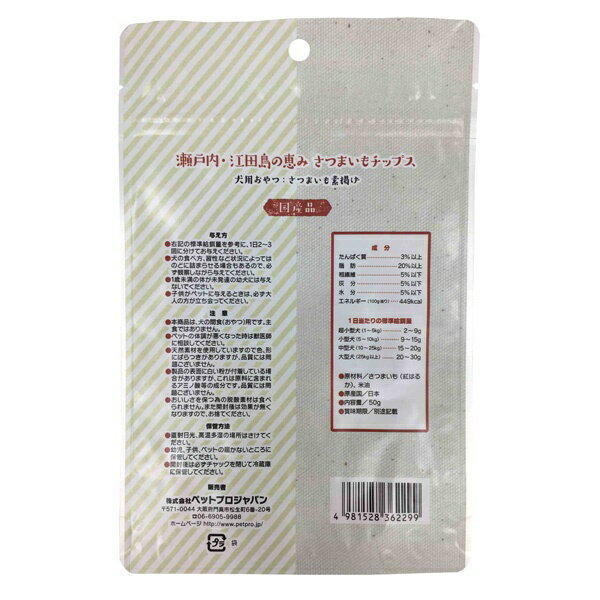 【原材料】さつまいも(紅はるか)、米油□保証成分:たんぱく質3%以上、脂肪20%以上、粗繊維5%以下、灰分5%以下、水分5%以下□エネルギー:100gあたり449kcaL【給与方法】直射日光、高温多湿の場所は避けてください。
